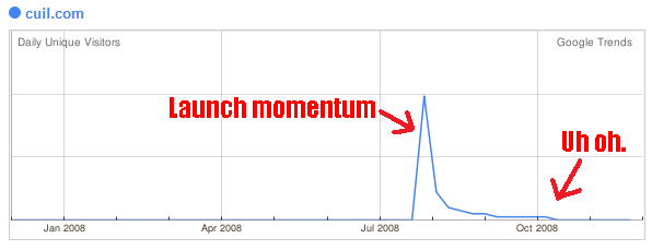 Well, no. Cuil isn’t performing well any way you look at it, and I can only imagine how nervous the startup’s management team and investors must be by now. Based on the numbers and graphs we gather from Google Trends, Alexa, Compete and Quantcast, you could even say search engine traffic is nearing rock bottom. Apart from that, a Cuil search for ‘TechCrunch’ still displays a Gmail logo rather than our own.