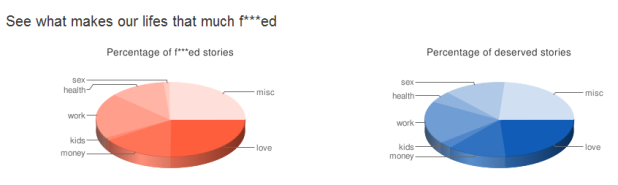 There are currently only 100 stories on the website, but if you have anything to complain about in your life, eat your heart out (in max. 300 characters). Do remember to assign the correct category, so F*MyLife can keep making these graphs as an insight into what makes people miserable the most.