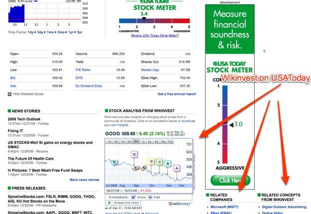 Each stock page on USAToday also includes community analysis and links to related concepts from Wikinvest as well. Wikinvest charts can be annotated with news stories and embedded elsewhere. For instance here is a chart from USAToday’s Google stock page:
