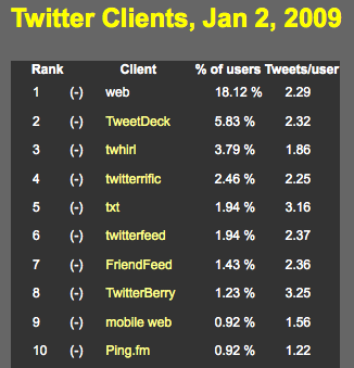 Twitstat, an analytics site for Twitter, has just put together a dynamic listing of the most popular Twitter clients based on the number of Tweets sent per user – in other words, it lets us see which client has the most addicted Twitter users.