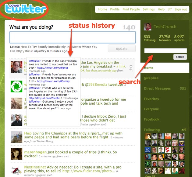 Power Twitter moves Twitter Search, inconveniently located on a different subdomain, right into the Twitter site itself. You can also just search a single user’s updates from that user’s Twitter page. Twitter should have long ago integrated a search box directly onto the logged-in Twitter home page. They haven’t, but Power Twitter fixes this.