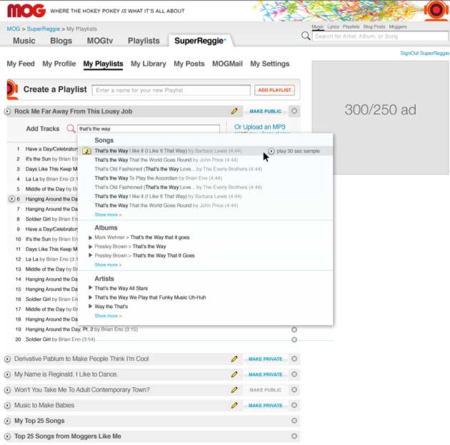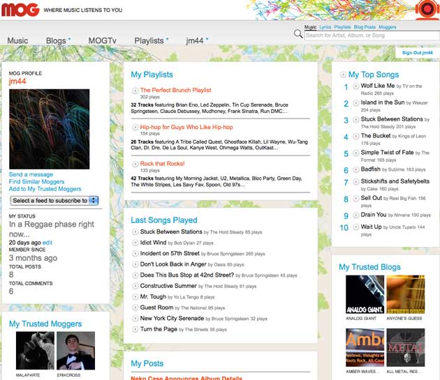 MOG has a history of doing cool new things around music. The service today includes a media player plugin that records and analyzes your music habits, a website that has a dedicated page for every artist, album and song with user generated reviews and posts, and an advertising network that provides revenue for 300 top music blogs. Users can also stream music via an excellent front end to Rhapsody.