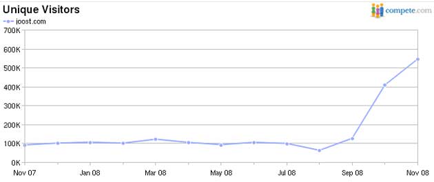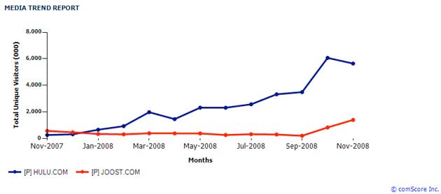 A year ago the online video site was a ghost town. Then in September, when the company moved away from the use of downloaded software to an all-browser video experience, viewership spiked. Compete says they had 550k U.S. visitors in November 2008. Comscore gives an even more robust 1.4 million worldwide monthly visitors in November (a chart below compares Joost to Hulu). Google Trends also say things are going well for Joost, and points to strong traffic growth in Northern Europe.