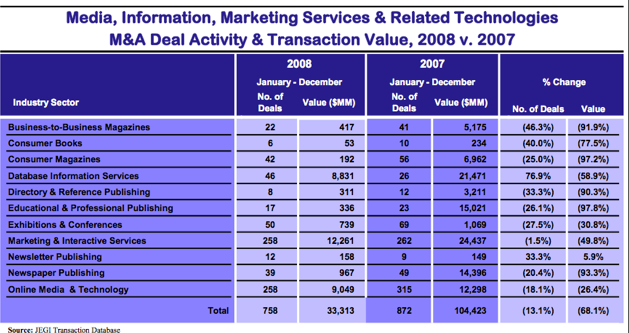 In a year when the value of venture-backed mergers and acquisitions were down 51 percent, M&A activity in the publishing industry was down even more. Jordan, Edmiston counts a 68 percent drop in the value of publishing media deals from $104 billion in 2007 to $33 billion in 2008. Most of these are not venture-backed startups, but many of them were tech-related. Among the top ten media M&A deals in the report are CBS’s $1.8 billion acquisition of Cnet, eBay’s $945 million purchase of Bill Me Later, and AOL’s $850 million acquisition of Bebo.