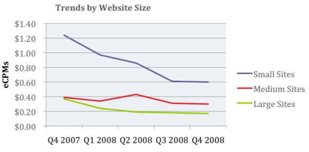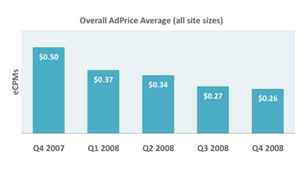 In the fourth quarter of 2008, the average price for remnant ads across all sites was $0.26 per thousand impressions (CPM), down 48 percent from the fourth quarter of 2007 and a penny down from the third quarter. Normally, there is a huge jump between the third and fourth quarters because of the holiday season, so this is not a good sign.