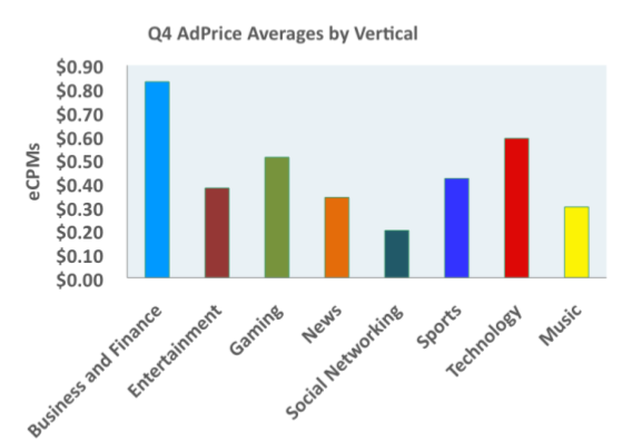 The vertical categories that saw the highest ad rates for remnant inventory were Business and Finance ($0.83, down 61 percent year-over-year), Technology ($0.59 down 41 percent), and Gaming ($0.51, the one category that was up from a year ago, 31 percent). Sports sites were commanding $0.40 eCPMs (down 8.7 percent from a year ago, entertainment sites were getting $0.38 eCPMs (down 40 percent), news sites were getting $0.34 eCPMs (down 36 percent), music sites were collecting $0.30 eCPMs (down 61.5 percent), and scraping the bottom of the barrel were social networks with $0.20 eCPMs (down 54 percent).
