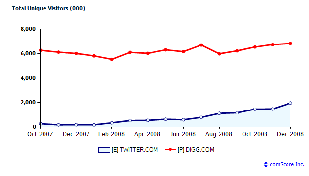 For what it’s worth, Google Trends for Websites also shows Twitter catching up to Digg (but not yet passing). Other measuring services, such as Quantcast, Compete, and comScore, still show a wide gap. For instance, in the U.S. for December, comScore shows Digg.com at 6.8 million unique visitors versus 1.9 million for Twitter.com. (Update: See second chart below). That’s a pretty big gap to bridge in less than one month. I don’t buy the Hitwise numbers. Do you?