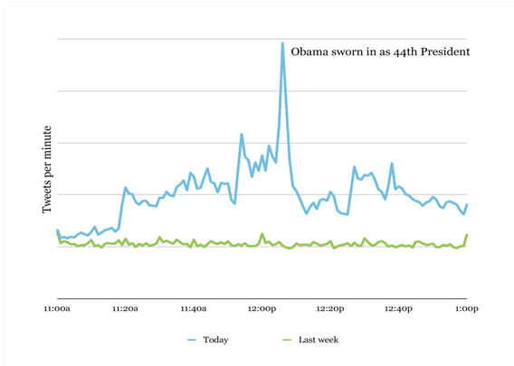 Today, traffic to Twitter was even higher with everybody feeling compelled to let everyone else know that, yes, in fact, the U.S. has a new president and that they saw his inauguration speech. (You too?) Twitter co-founder Biz Stone blogs that Twitter saw five times as many Tweets per second today compared to last week. (See chart below). So maybe those two lines between Digg and Twitter will keep diverging, or at least keep converging.