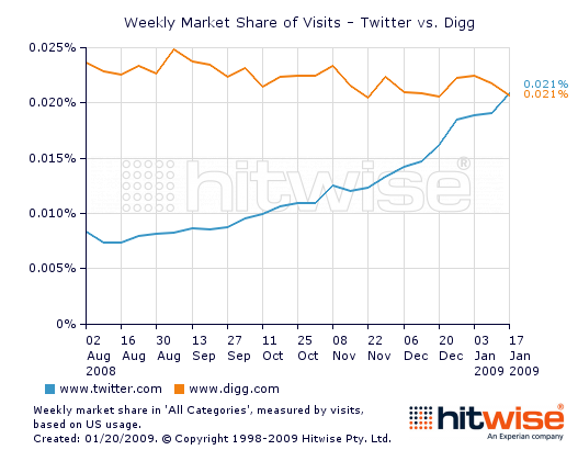 According to Hitwise, last week visits to Twitter surpassed visits to Digg for the first time. Hitwise measures visits in terms of “market share,” which isn’t a very helpful metric (both have 0.021 percent market share, but Twitter is ranked No. 84 and Digg is No. 85). This data is of last week, when visits to Twitter surged following the much-Tweeted emergency landing of a plane on the Hudson. (Note that these numbers do not include usage on mobile devices, desktop apps, or through other Websites via Twitter’s API).