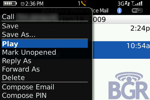 Doin’ what they do with their ninja leak squad, BGR has managed to finagle a set of shots detailing the new Visual Voicemail functionality from head to toe. It all seems fairly simple – tapping into any voicemail in the list brings up playback control, while highlighting one and pressing the softkey allows for callback and message management (We’re wondering what that “Forward” option does). AT&T’s Visual Voicemail infrastructure is already in place – now it’s up to RIM and AT&T to get OS 4.6.0.219 rolled out to the masses.