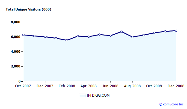 The paring back at Digg comes along during a brutal advertising recession, and flattening growth at the site. In the U.S., Digg attracted 6.8 million unique visitors in December, up only 2 percent since its last peak in July (comScore numbers). Worldwide, the site is doing a little better, with 17.7 million unique visitors in December, up 7 percent from July