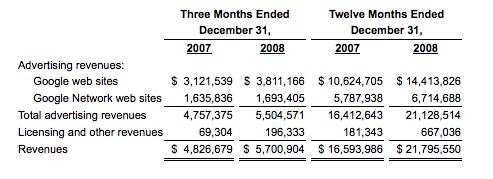 Total revenues (including what it pays out to AdSense publishers and other partners) came in at $5.7 billion for the quarter, up 18 percent. For the year, total revenues were $21.8 billion, up 31 percent. Operating income for the quarter (before the impairment charge) was $1.86 billion, up 29 percent. The company had $8.6 billion in cash at the end of the quarter