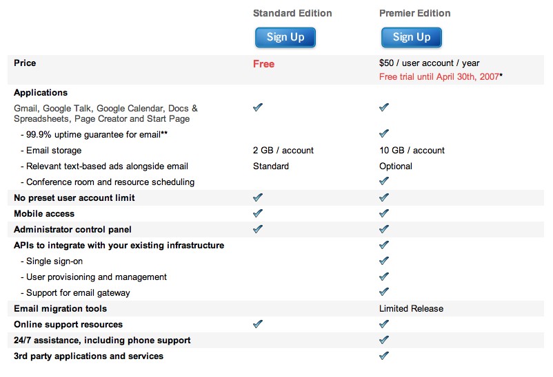 Free for everyone lasted until February 2007, when Google announced a premier edition of the service with more storage and an uptime guarantee. The cost was (and is) $50 per user per year.