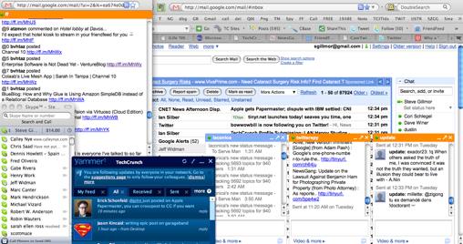 Then there’s the lack of intelligence in managing these multiple windows. Each reboot of FireFox mandates popping out the same set of windows and then dragging and resizing them into position. FireFox 3 added auto-recovery of tabs and their contents, but a FriendFeed realtime Gtalk IM pop-out when recovered has to be closed and reopened. No smarts, no access to user configuration, no continued disruption.