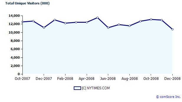 One factor that might be contributing to the decline in online advertising for the New York Times is a 17 percent drop in U.S. visitors to its flagship site, NYTimes.com. According to comScore, the site attracted 10.8 million U.S> visitors in December, down from 13 million in November. Globally, the site attracted 17.9 million visitors in December, down 14 percent. Call it post-election blues.