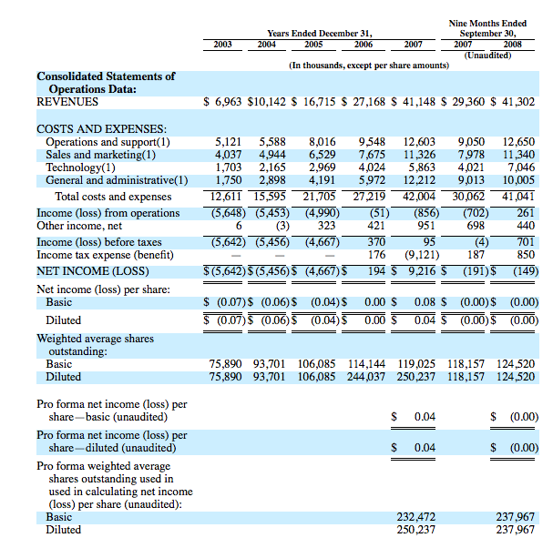 Revenues through the nine months ended September 30, 2008 were $41.3 million, a 41 percent increase from the same period in 2007. The company makes money from the restaurants, which pay both subscription fees (54 percent of revenues) and reservation fees for each diner that shows up through the system (42 percent of revenues). It also makes a small amount on installation fees (4 percent of revenues).