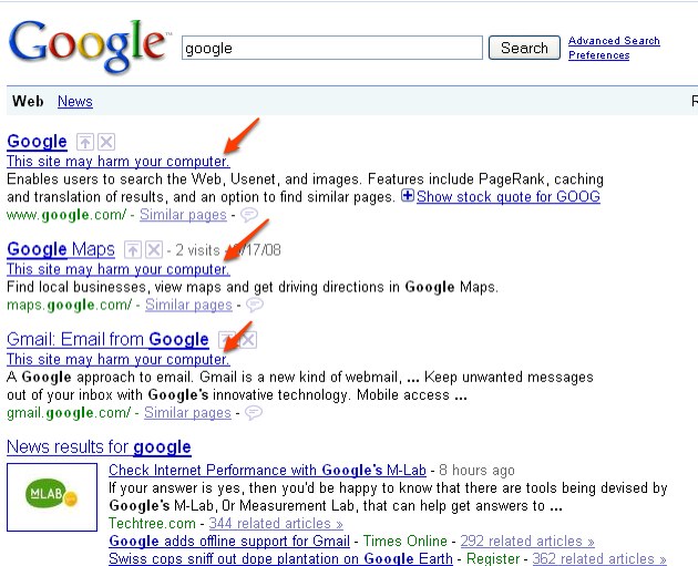 If you did a Google search between 6:30 a.m. PST and 7:25 a.m. PST this morning, you likely saw that the message “This site may harm your computer” accompanied each and every search result. This was clearly an error, and we are very sorry for the inconvenience caused to our users.