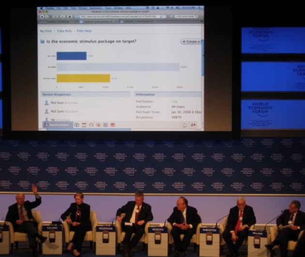 Zuckerberg arranged for Facebook polls to be conducted during twelve key sessions. In one poll, during a session called Advice to the US President on Competitiveness, Facebook users were asked if the stimulus package is on target. 120,000 responses were recorded in twenty minutes. 59% of respondents said “no,” 15% said “yes” and 26% said unsure.