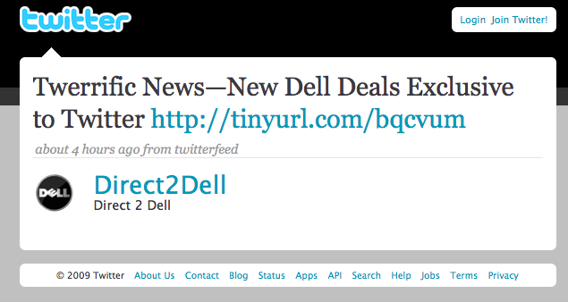 Dell’s Twitter experiment seems to be working. After making $1 million during the holidays by alerting Twitter followers to sale items, Dell is now offering discounts exclusively to the 11,844 people who follow @DellOutlet. For instance, here is a Tweet with a link to a 30-percent-off deal on an XPS laptop. When you click on the link, it takes you to this product page on Dell.com.