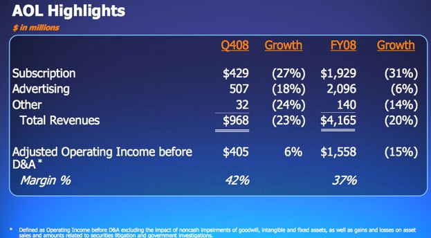 It doesn’t say in the earnings release, but its biggest acquisition last year was the $850 million it paid for social network Bebo. It is now clear that AOL overpaid. But how much does AOL think it is worth now? 200 million? I have calls and emails into AOL, but don’t really expect them to answer that.