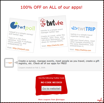 You create an coupon on the twtQpon site, and then, like the developer’s other apps, micro-message with a tiny URL on Twitter or Facebook. The link takes people to back to the advertised website to redeem the coupon.