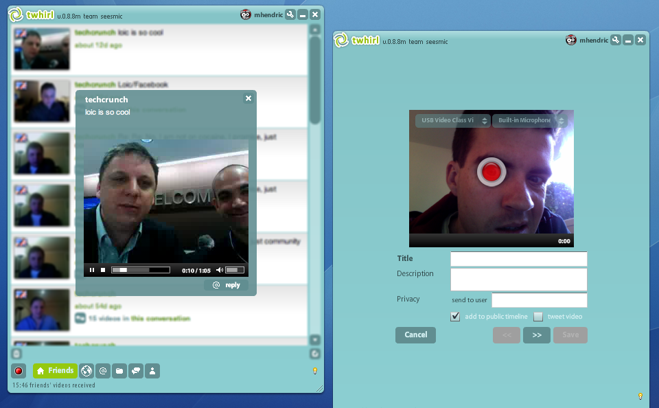 Until today, users could only play video clips through Twhirl from the people they follow on Seesmic. But now with version 0.9, Seesmic users can record and post video clips from within Twhirl as well, bringing the construction of a Seesmic desktop client to completion.