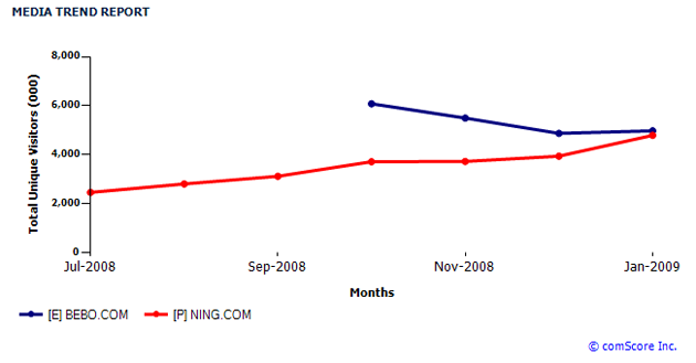 Ning gave adult networks until January 5th to pack up their bags and leave. That gives us the rest of the month to see how the network of networks fared without them. And it actually fared quite well, picking up almost 1 million unique visitors in the United States (from 3.94 million in December to 4.79 million in January). That pickup is almost enough to pass Bebo, which attracted 4.97 million Americans in January and barely managed to halt a downslide that surely didn’t make AOL happy.