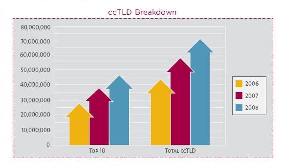 Last year ended with 71.1 million ccTLD (country code Top Level Domains) registrations, a 22 percent increase over the end of 2007. In total, there are more than 240 ccTLD extensions globally, but the top 10 ccTLDs contribute 65 percent of the total number of registrations. Unsurprisingly, .ru (Russian Federation) and .cn (China) were the fastest growing. But overall, the growth of ccTLDs is also slowing down: only 36 percent of the top 25 largest ccTLDs experienced growth rates in the fourth quarter that were higher than the growth rates in the third quarter.