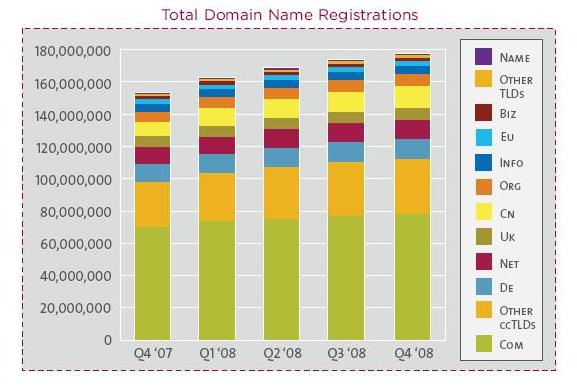 As you could have deducted from the headline, last year ended with a total base of 177 million domain name registrations across all of the Top Level Domains (TLDs), up from 153 million at the end of 2007 representing a 16% growth rate. Over the entire year, there was an average of 11.9 million new domain names registered per quarter compared to an average of 12.2 million new domain names registered each quarter in 2007.