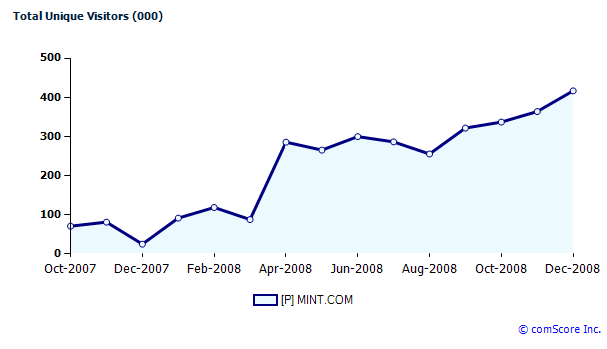 Aside from Mint’s remarkable growth rate, Intuit’s concerns focus on the startup’s definition of “users”. Mint’s reply states that the company considers anyone who has filled in an Email address, Zip code, and password to be a “user”, regardless of whether they’ve ever actually linked their bank account to their Mint user name. This figure obviously overstates the number of people who actually use Mint on a day-to-day basis, but it’s also a fairly standard way to define “users” for most web services. As an outside check, Comscore counts 416,000 monthly unique visitors worldwide, and growing rapidly (see chart below).