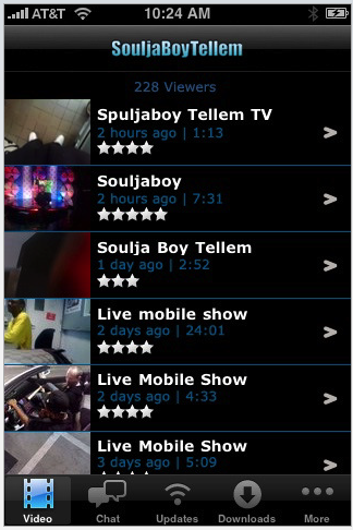 Besides Twitter feeds, RSS, and chat, Kyte also offers a listing of each artist’s most recent videos taken using Kyte.tv‘s mobile phone video apps. And, perhaps most importantly for the artists, each app features a list of links to songs in the music section of Apple’s iTunes store.