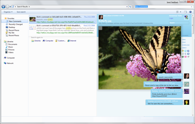 The service would essentially be capable of providing you with a secure unique ID for all the files and folders on your desktop, enabling users to share, comment on, tag and search files like photos and videos via a dedicated web page powered by .NET. Think of this as social URLs that link to files which could easily be pushed to third-party services like Twitter or Digg but also Microsoft’s own Windows Live Messenger without the need for you to copy, move or upload anything. Furthermore, social interaction around the files would be visible from inside the Windows desktop OS, blurring the line between the desktop and the web even more.