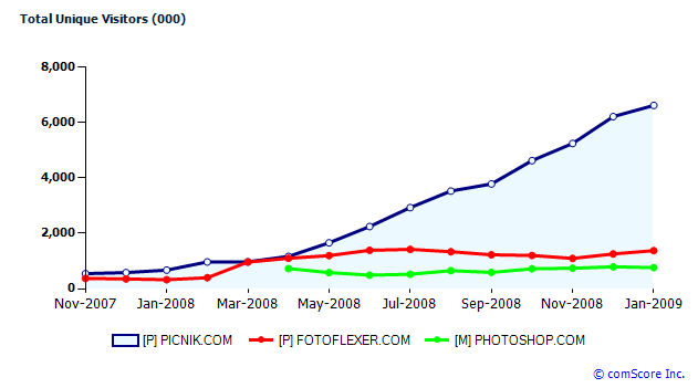 Picnik is a powerful, cloud-based photo editor that is integrated directly into Flickr, SmugMug and other photo repositories. Competing online photo editors such as Fotoflexer and Photoshop.com (formerly and Photoshop Express) attract only a fraction as many users (1.4 million uniques for Fotoflexer and 760,000 for Photoshop.com.