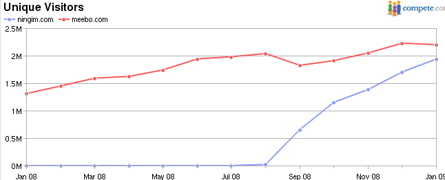 Ning originally introduced a more basic chat feature last summer, but that version uses either dedicated chat pages or sidebar iFrames, which means they aren’t always visible as users navigate through a network. But even the basic version has proven to be very successful – Ning’s chat traffic has skyrocketed, as seen in the Compete graph below pitting Ning’s IM domain against Meebo’s homepage. To be fair, the graph probably doesn’t take into account Meebo’s traffic that occurs offsite (Quantcast reports that Meebo’s entire network sees more like 12 million uniques), but it’s clear that Ning Chat is rapidly gaining traction.