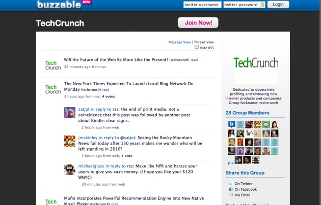 Groups are built around RSS feeds. So the TechCrunch group is simply our feed. But you can set up topic-specific groups which pull from a number of feeds, including Google News, Eventful, Digg, Yahoo Finance, Twitter itself, blogs, and so on. You can set it up so that the feeds are filtered by keyword (such as “Android,” Kindle,” “Knicks,” etc.). Members of the group can then discuss any headline by commenting in-line. Each comment can be pushed out to Twitter proper as well. Both RSS headlines and comments can be “Buzzed” up by popular vote. The result is a combination of RSS content and Twitter conversation, all in the same stream.