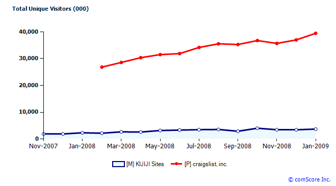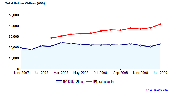 Maybe it also has something to do with the “j”s and “i”s blending together beyond recognition in “Kijiji.” It’s not just the name that needs work. The number of visitors to Kijiji sites worldwide was up only 7 percent in January to 23.2 million, while Craigslist grew six times faster and widened the gap. It ended January with 41.4 million unique visitors (see comScore chart below).