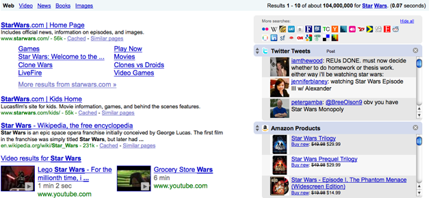 WebMynd isn’t the first browser plugin to offer complementary results from other sites, but what it lacks in originally it makes up for with its polished execution. After installing the plugin, users simply visit one of the supported search engines (which include Google, Yahoo, and Live Search), and search for a query as usual. The plugin inserts a handful of small widgets at the right hand of the screen, each of which includes the first few matches of the same query from sites like Twitter, Amazon, or Digg. Users can choose from over 25 different search sites that they’d like to include in their results. The inserted widgets take some getting used to, but in practice they’re surprisingly useful.