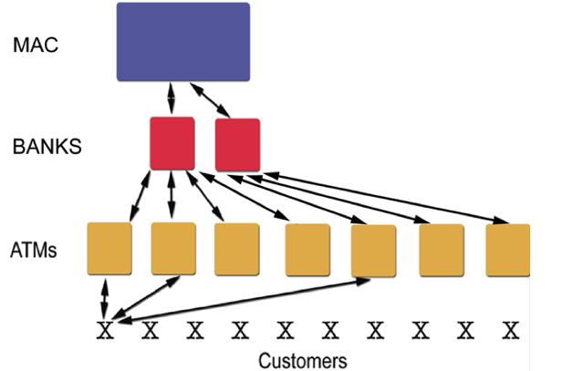 In contrast, each bank is positioned between its customers and the ATM network service provider MAC. If a bank is denied access to the network, at least its own cards will work on its own machines. Moreover, each bank used an identical interface in its communications with MAC. Therefore the banks were able to forge an alliance — if PNB attempted to compete unfairly against any one of them, they would simply implement bilateral switching among themselves and cut MAC out entirely.
