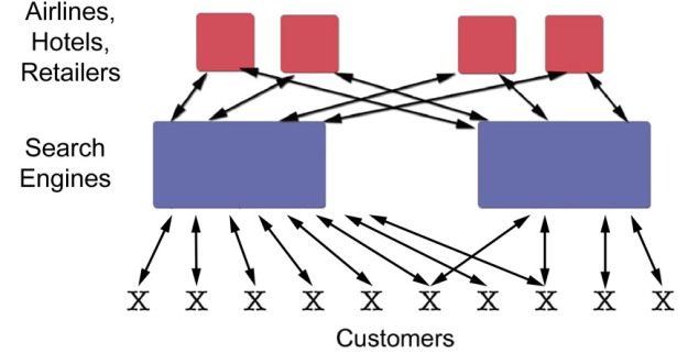 Clearly, Google’s market share for sponsored search and for search generally is larger than Sabre or Apollo ever enjoyed, and clearly Google comes between the shopper and the ultimate service provider (hotel, airline, retailer, or manufacturer), just as we saw in the case of the airline CRSs. The conditions are right for Google to enjoy enormous market power over service providers, who feel they must bid for positions in Google’s sponsored search keyword auctions.
