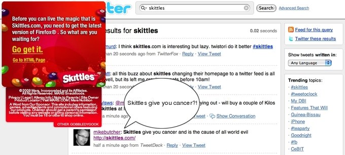 Whoever is running the digital marketing for the Skittles candy brand has a strong constitution. They are clearly not afraid of the Wildean maxim “The only thing worse than being talked about is not being talked about.” Today, the Mars-owned brand changed the Skittles home page to a Twitter search page pre-set to search for the word Skittles. The result was predictable. We all started tweeting about it, and increasingly in not a nice way, as Twitterers attempted to see how much abuse they could take. But clearly they are up for the conversational experiment. The brand has also been re-directing to its Wikipedia entry.
