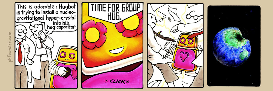 Why Toshiba is experimenting with hugbots is beyond me, but that’s not the issue here (never thought I’d say that). After the robot (Kenji) became very friendly indeed with a doll, it became infatuated with a female intern. One night it blocked the exit and began to hug her with his enormous hydraulic arms. He expressed his sentiment in animal noises.