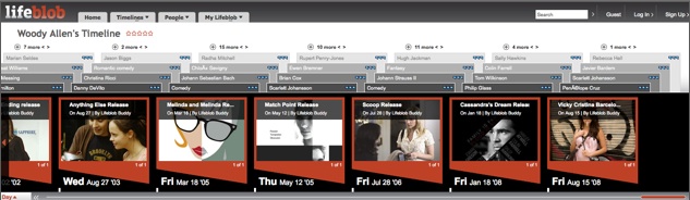 It also works as a marketing vehicle. For instance, here is a timeline of all of Woody Allen’s movies, with connections to timelines for actors who have appeared in his movies. The UI is nice, but if you click any of the frames in the embed above with a screen resolution lower than 1024×768, you’ll immediately notice it still needs quite a bit of fine-tuning, as you can’t resize it properly and the menu items are all over the place. That said, it’s a pretty cool service reminiscent of tools like Dipity and Kronomy but with a more social approach. Definitely a tool I’d consider using to recap events, which I think it is most suited for. Turning your whole life into a lifeblob seems like a whole lot of work, unless you could auto-update from other services (right now, only Picasa is supported).