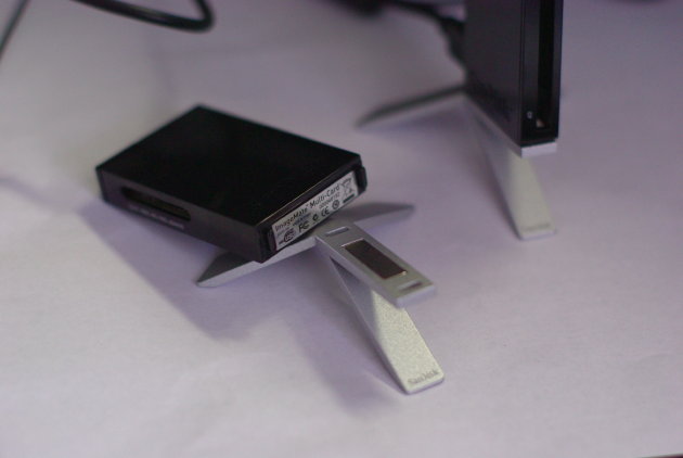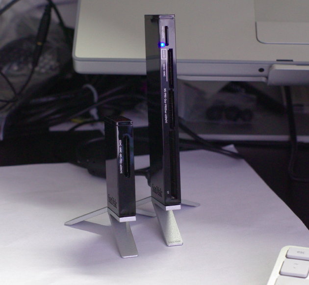 On the flipside, these ImageMate readers look great. The USB-powered readers sit atop metal stands and are held secure by magnets. You have to be rather gentle when the reader is placed on top of the stands, though. The magnets aren’t that strong, so the reader could easily be knocked off its perch. The transfer button is inconspicuously placed on the top corner of each reader by the card slots, which is nice but only the back half of the button works. The front half of the transfer button doesn’t move.
