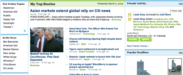 Upon entering the site, new users are invited to enter some of their favorite topics, which range from mainstays like Sports and Technology to more specialized areas, like Stem Cells. Users can also specify certain companies or keywords to monitor. From there, MeeHive builds a digital newspaper, using content from a variety of sources including news sites like CNN as well as a wide selection of blogs (the system uses an authority algorithm to help weed out the best content). The Kosmix algorithm works well, pulling in relevant stories without any false matches (at least for common topics) and ensuring that the same story isn’t shown multiple times.