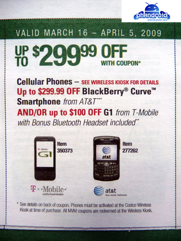 Head down to Costco, my little monkeys, for there you will find a T-Mobile G1 for $79.99. Note you have to bring the coupon from your Costco flyer but it’s $20 less than Amazon had it yesterday. You have to get a 2-year contract, but who cares, right? You’ll be keeping the G1 for years!