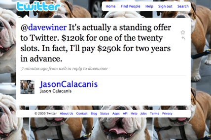 Mahalo CEO Jason Calacanis, who is no Twitter slouch himself with 61,266 hard-earned followers, thinks that being one of the top 20 on the suggested list will be worth as much as a Superbowl ad within five years. He is offering Twitter $250,000 to lock in a spot on the suggested list for two years, or $120,000 for one year. I emailed Calacanis (who is our partner in putting on the TechCrunch 50 conference) and he confirms the offer is dead serious. In fact, he contacted Twitter co-founders Jack Dorsey and Evan Williams last week about it, and is lobbying investor Fred Wilson. Calacanis writes: