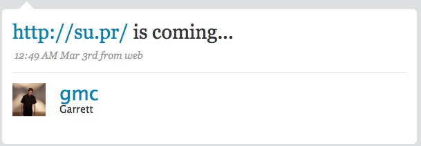 StumbleUpon is preparing to launch a shortURL service (a web service that provides short aliases for redirection of long URLs, like TinyURL or Bit.ly) in the next couple of weeks called su.pr.