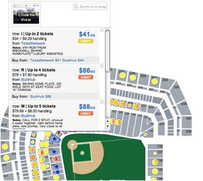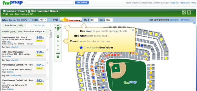 Here’s the really cool part. Next to the search results, FanSnap has an interactive map of the event venue, which includes a “best value” feature that highlights at-a-glance those ticket offers that are priced significantly lower than surrounding offers. The value of the tickets are color-coded, with yellow being the lowest price and dark red being the highest price. The available tickets are distributed over the venue map, with the “best value” tickets as determined by FanSnap’s technology (the best tickets for the lowest price) represented by stars.