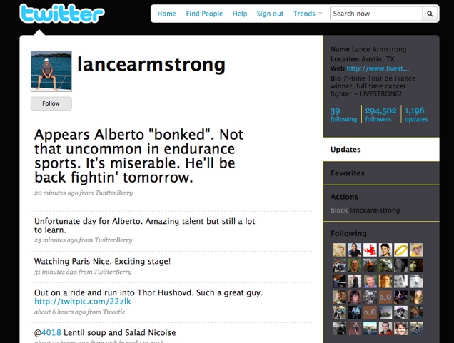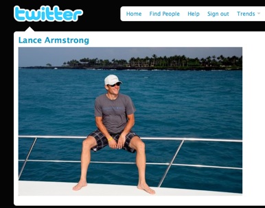 When Lance Armstrong sat down with John Battelle at the Web 2.0 Summit last November, he had been twittering for about 10 days and was jokingly asking that “shoe guy” to send some followers his way. Now four months later, even Richard Rosenblatt, CEO of Demand Media and the guy who helped get Lance into Twitter, has been surprised by how much @lancearmstrong has taken to the platform: twittering and twitpic’n about training, races, travel, family, food, movies, and his mission to grow the fight against cancer.