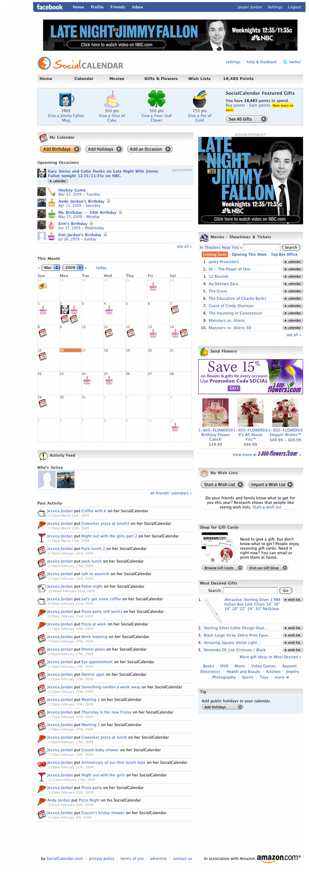 SocialCalendar lets you plan events among Facebook friends, get movie showtimes and integrate events into a public calendar. Users can also import and get email reminders about events, birthdays and anniversaries. The app also lets you use virtual good icons to mark events and allows you to give virtual goods, like a birthday cake, to friends for special occasions. The price of virtual goods on the site ranges from $0.50 to $1.00 (some are free as well). The calendar app also allows users to make gift wish lists through Amazon and distribute the lists to friends and family.